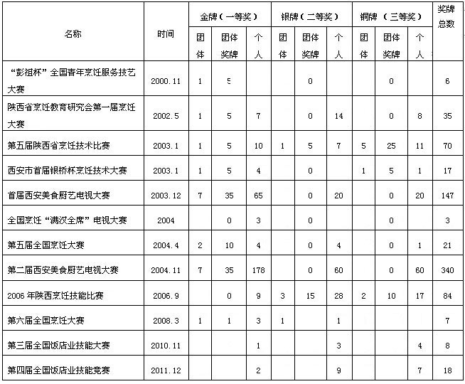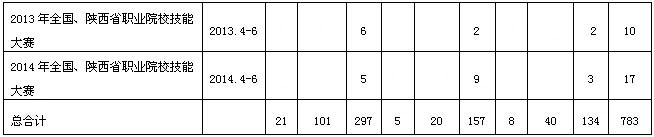 2、我院师生在历届技能大赛中荣获各类奖牌783枚;其中在2014年全国职业院校技能大赛中6名学生代表陕西队参赛,分别荣获银奖2个,铜奖4个;在陕西省职业院校技能大赛中11名学生分别荣获金奖5个,银奖8个。
