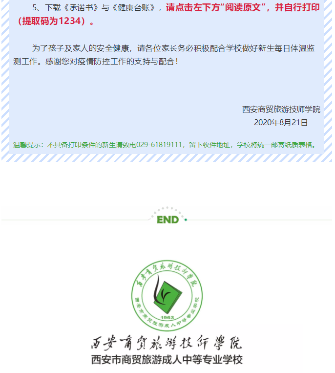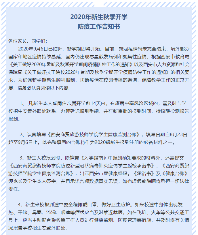 2020年新生秋季开学防疫工作告知书