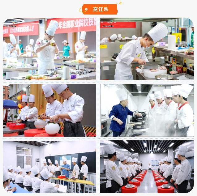 学院目前开设有烹饪(中式烹调)、烹饪(西式烹调)、烘焙工艺、旅游服务与管理、导游服务、动漫与游戏制作、网络营销、食品加工技术、旅游管理、电子商务等专业,其中包含三个国家级名牌专业、三个国家级特色专业,办学层次涵盖中职、高技能大专及预备技师三个层次。